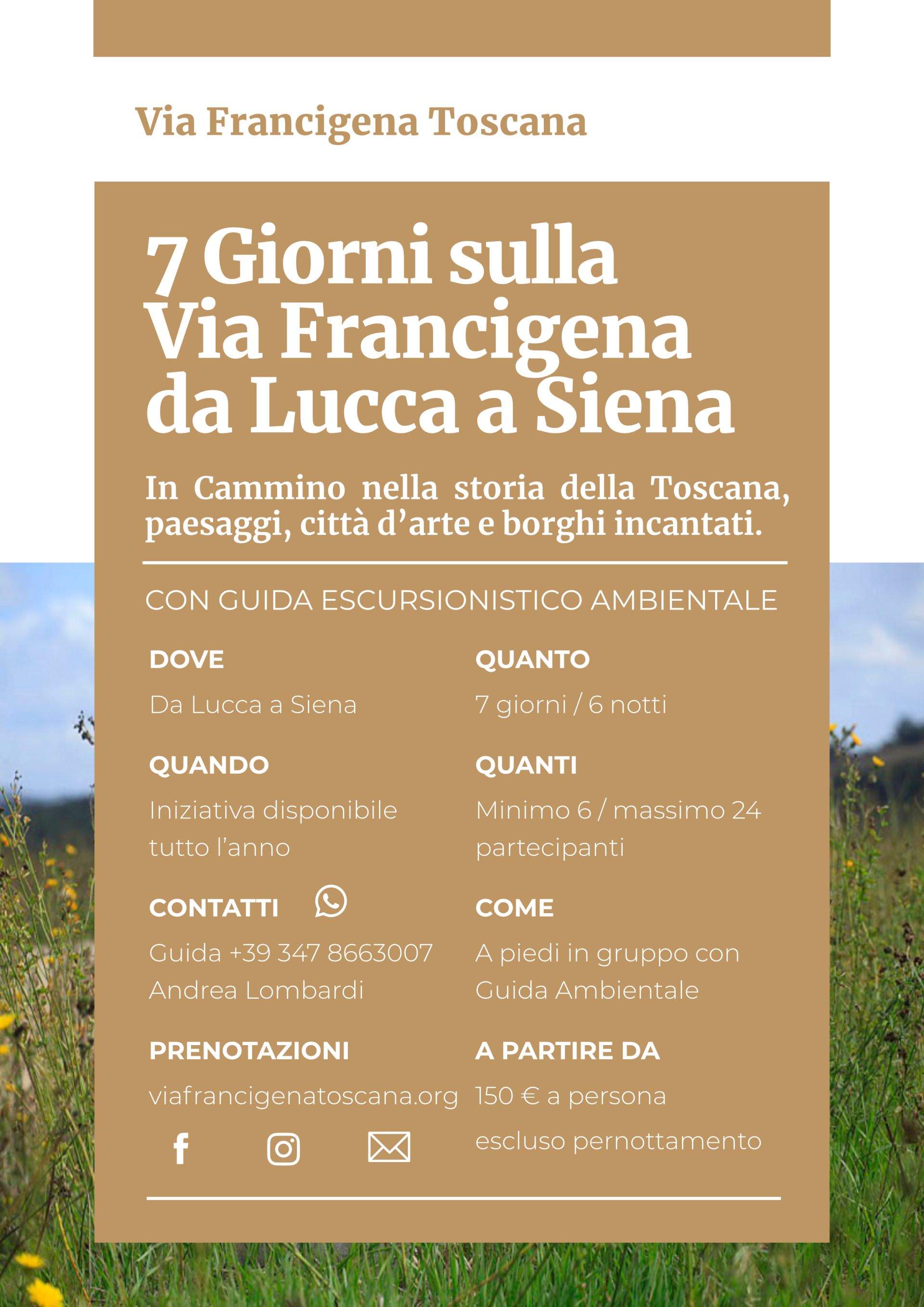 Un cammino attraverso la storia e la cultura della Toscana, sulla Via Francigena, che da Lucca ci porterà a Siena, visitando città d’arte e borghi incantati