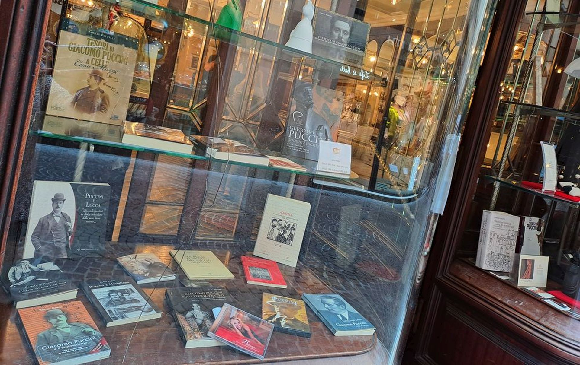 “Questo caffè in cui echeggiò l'entusiasmo del risorgimento accolse alla fine dell'ottocento e al principio del nostro secolo poeti letterati ed artisti amici del droghiere mecenate Alfredo Caselli fra cui Giovanni Pascoli Giuseppe Giacosa Alfredo Catalani Giacomo Puccini Pietro Mascagni Libero Andreotti e Lorenzo Viani.”