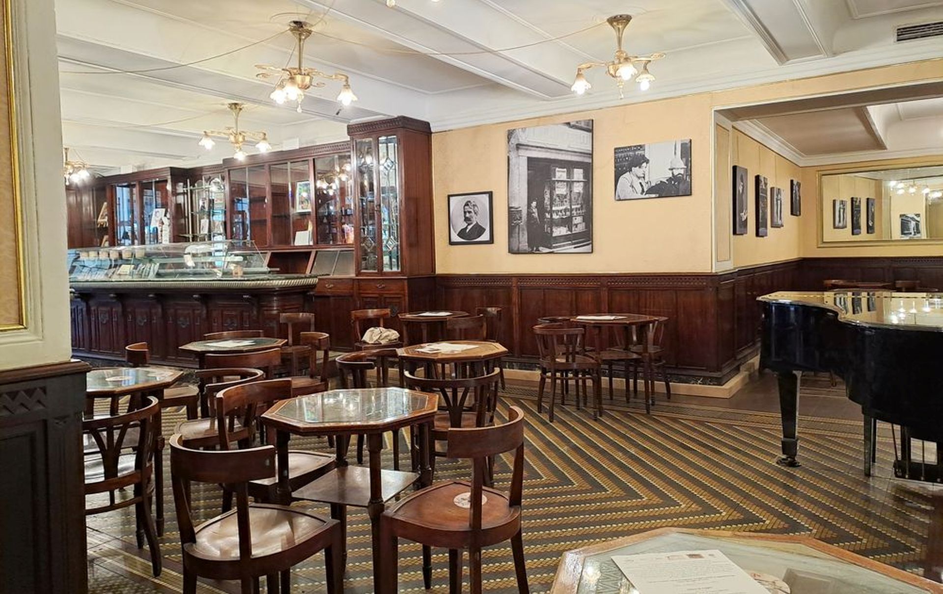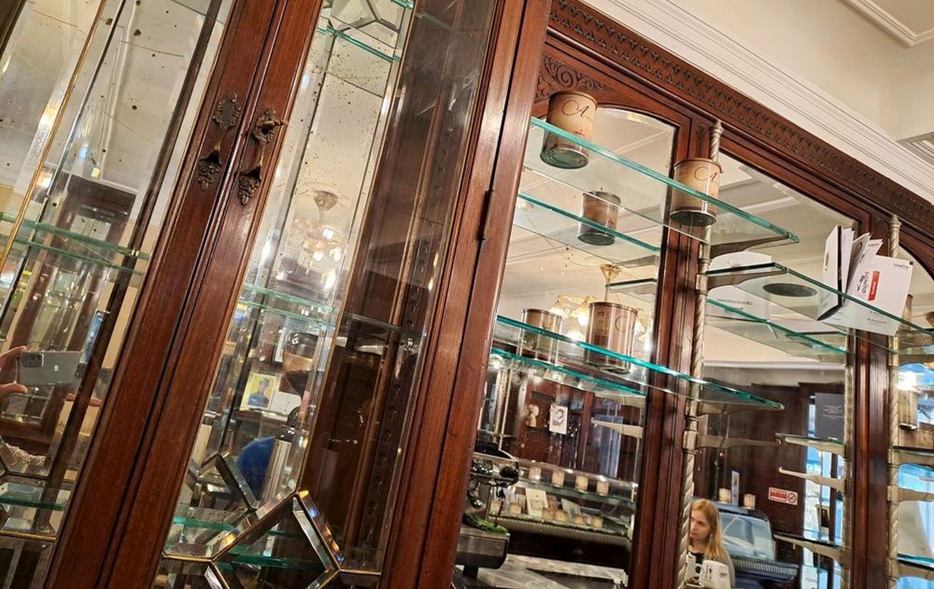Una grande insegna con scritte in oro su fondo neto, le decorazioni liberty della cornice in legno scuro, il grande vetro curvo della vetrina sempre luccicante sono lenote inconfondibili di questo luogo storico.