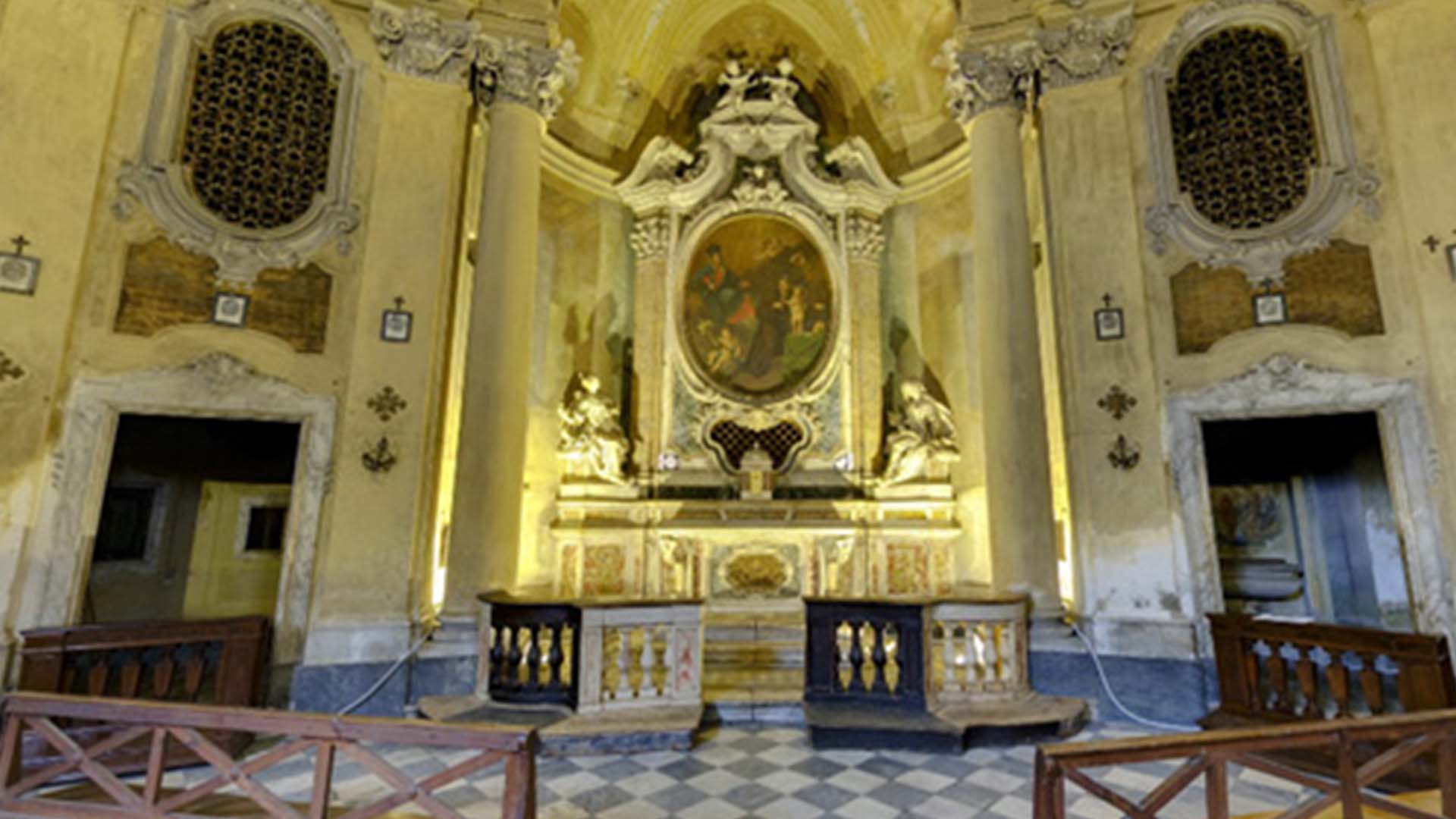 L’interno gode di straordinaria bellezza: la cupola, aperta al centro, è fonte di luce ed è decorata da un affresco raffigurante Putti e Santi ad opera di Bartolomeo De Santi.