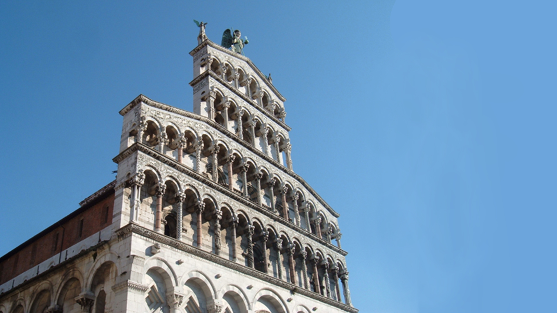 Sulla facciata spicca la grande statua di marmo dell'arcangelo Michele, con ali e lamine metalliche nell'atto di distruggere un drago con una lancia. Una leggenda lucchese vuole che nell'anello posto al dito dell'angelo sia incastonato un diamante di enormi dimensioni e che di sera possa essere scorto il suo luccichio posizionandosi in uno specifico punto della piazza.