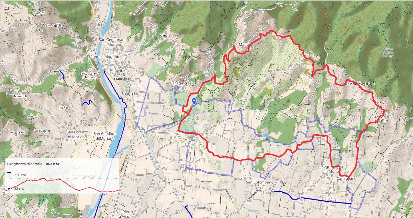 Having reached the plains at Capannori, we easily return to Marlia and the loop closes passing through inhabited but secondary roads without risk.