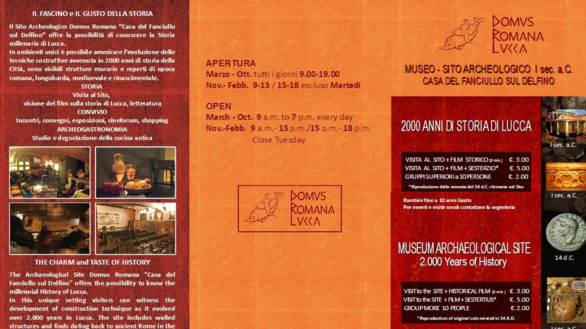 En un ambiente exclusivo y acogedor, la domus romana da la posibilidad de conocer la historia de Lucca y de pasar momentos especialmente sugestivos. Entre murallas romanas y bóvedas renacentistas, ánforas y collares, proyecciones de películas temáticas, compras en la Vetrina Antica, podremos revivir el encanto de la historia de la ciudad y degustar las exquisiteces de su cultura