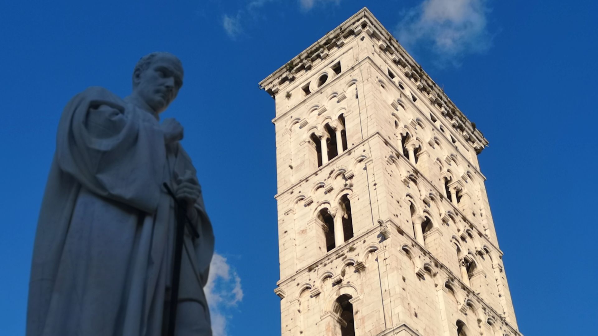 Sorge sul luogo dell'antico foro romano, all'incrocio perfetto delle due strade principali: il cardo massimo (da nord a sud, corrispondente alle attuali via Fillungo, via Cenami e via S. Giovanni) e il decumano massimo (da ovest ad est, le odierne via S. Paolino, via Roma e via S. Croce).