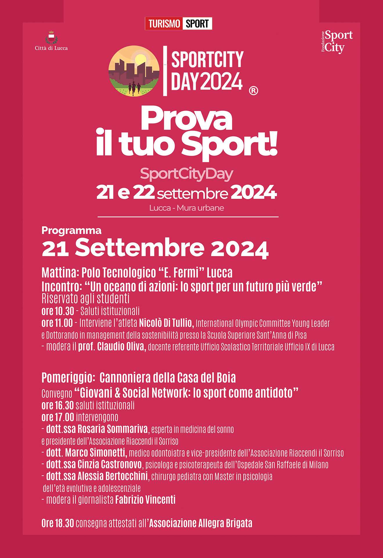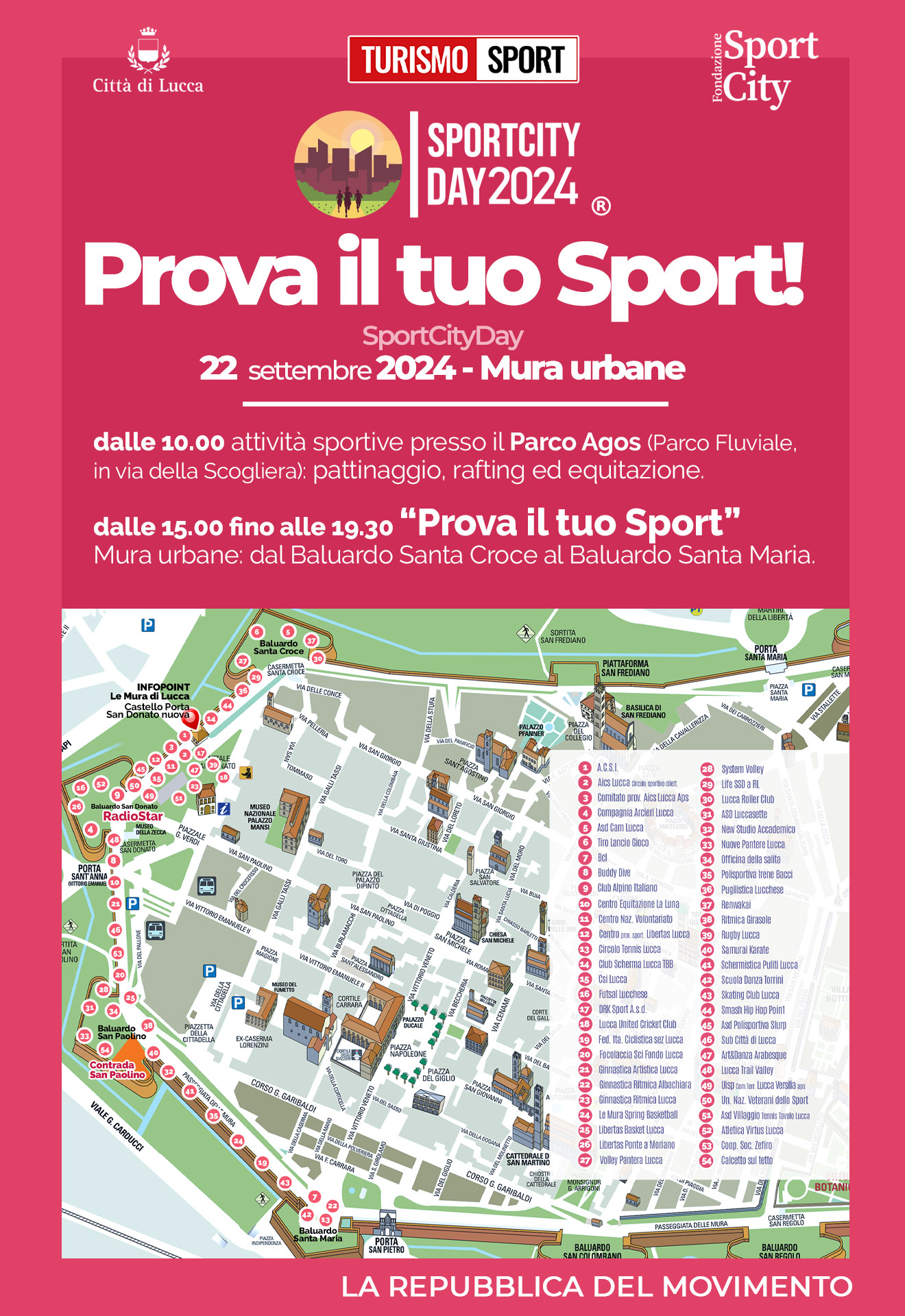Lucca, con altre 162 città italiane, partecipa alla quarta edizione dello Sport City Day, la manifestazione nazionale che promuove lo stile di vita attivo il benessere psicofisico e la pratica sportiva in ambito urbano, sabato 21 e domenica 22 settembre